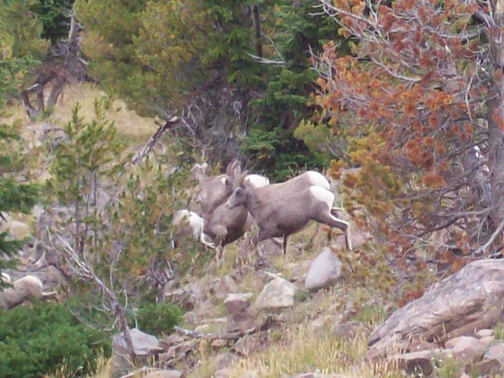 Up we ride, further into gods country, the clearing below are devoid of wildlife a sign of the impact the wolves have had on the local ecology. Here and there are tracks of a couple different grizzlies and some elk. The wind whispers in the pines as we wend our way up the various trails, making our way to our camp, nestled in a small bowl just below the ridge. Our camp is probably the only flat spot out of the wind for several miles. Directly to our south are two basins rimmed by rugged cliffs, the larger of the two wends off to the southeast dropping off into Tom Miner Basin. So far the terrain has been void of all wildlife save 2 mountain goats who casually made their way around a cliff face avoiding us.